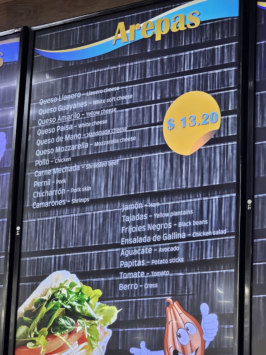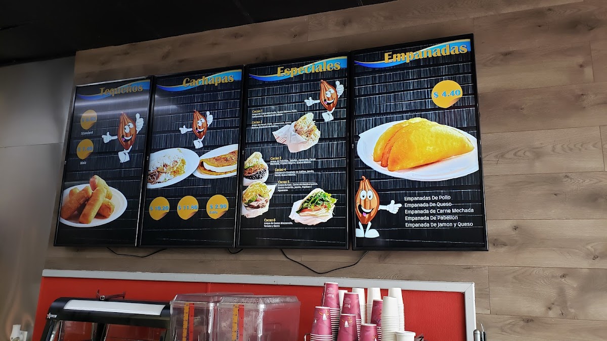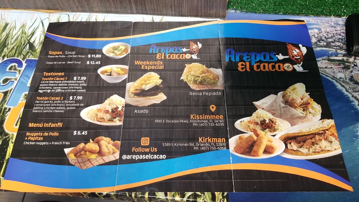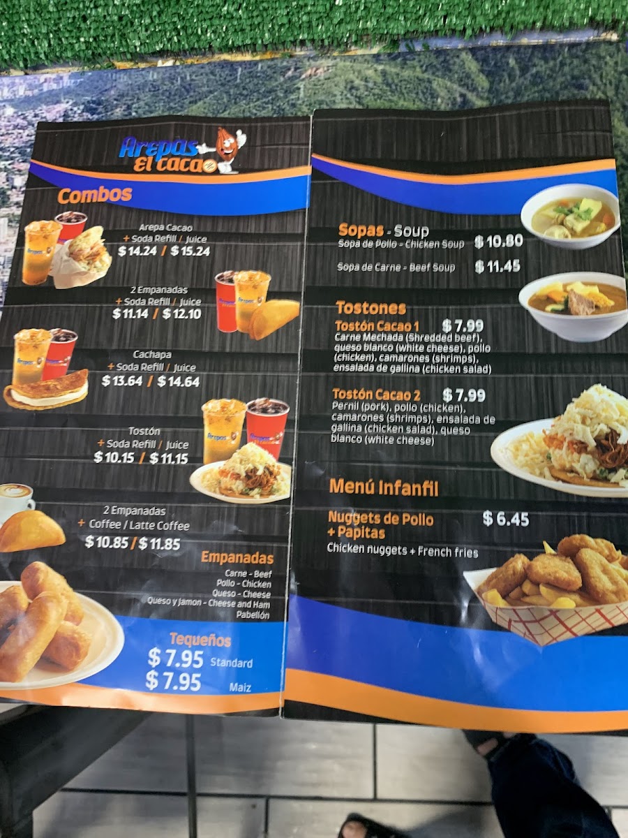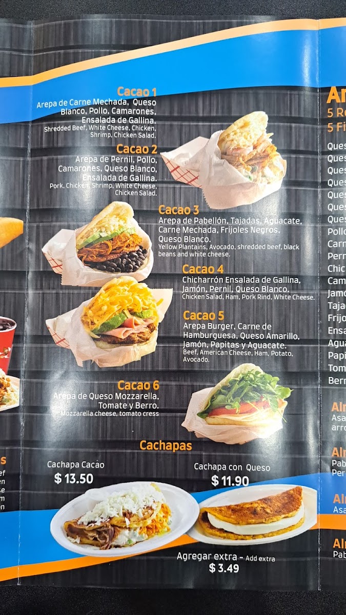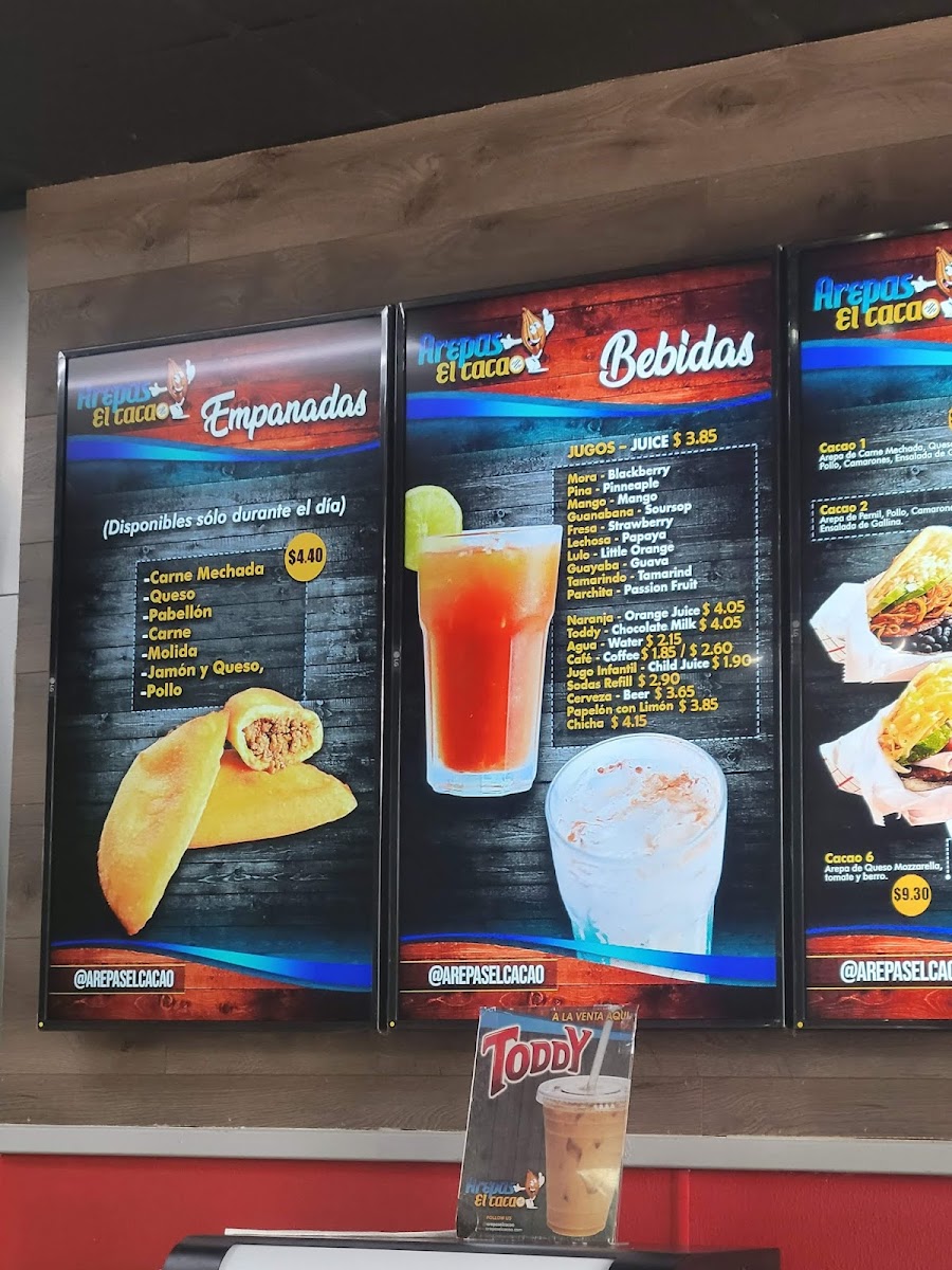 The menu at Arepas El Cacao features a variety of traditional Venezuelan dishes and beverages, clearly organized into several categories. Visitors can find a range of arepas with multiple filling options, including chicken, shredded meat, and cheese. Empanadas are available all day with different fillings such as chicken, cheese, shredded meat, ham and cheese, and pabellón style. The kids' menu offers familiar items like chicken nuggets and French fries, suitable for younger guests.